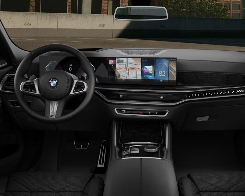 The interior of the X6 M60i is a realm of luxury, featuring the BMW Curved Display, which combines a 12.3-inch instrument display with a 14.9-inch Control Display. The cabin is also adorned with premium materials, including a leather-wrapped M steering wheel and optional carbon fibre trim, ensuring every drive is both comfortable and stylish.