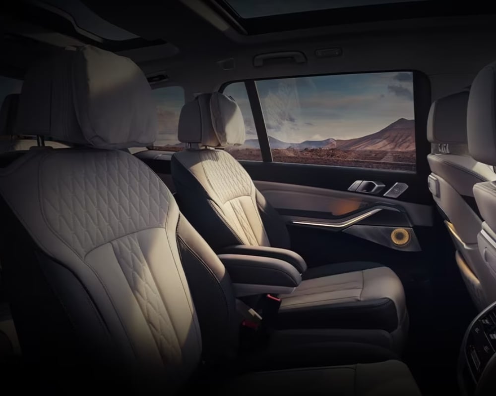 Inside, the X7 combines traditional luxury with modern aesthetics. Options range from glass iDrive controllers to unique Alpina detailing, such as blue illuminated gear selectors and custom leather steering wheels. The spacious cabin ensures comfort across all three rows. The interior is further enhanced by luxurious touches, like the Alpina production plaque and illuminated door sills.