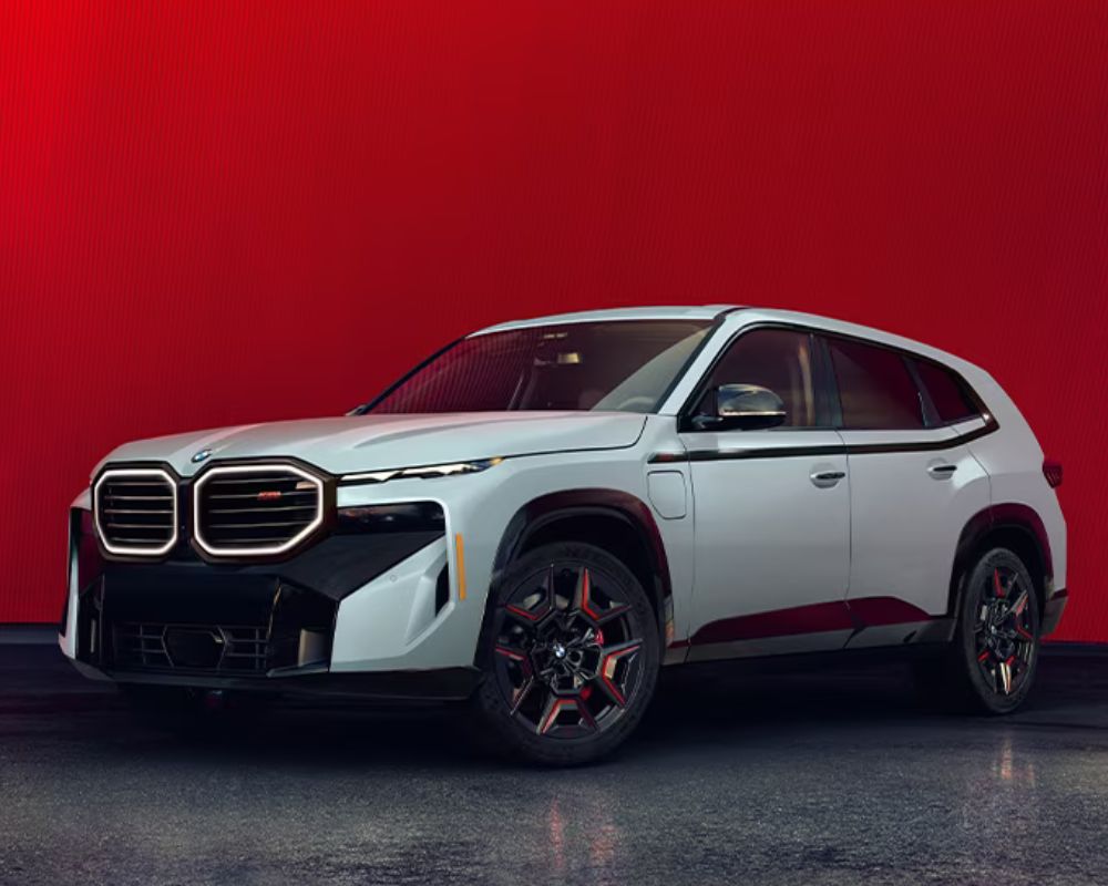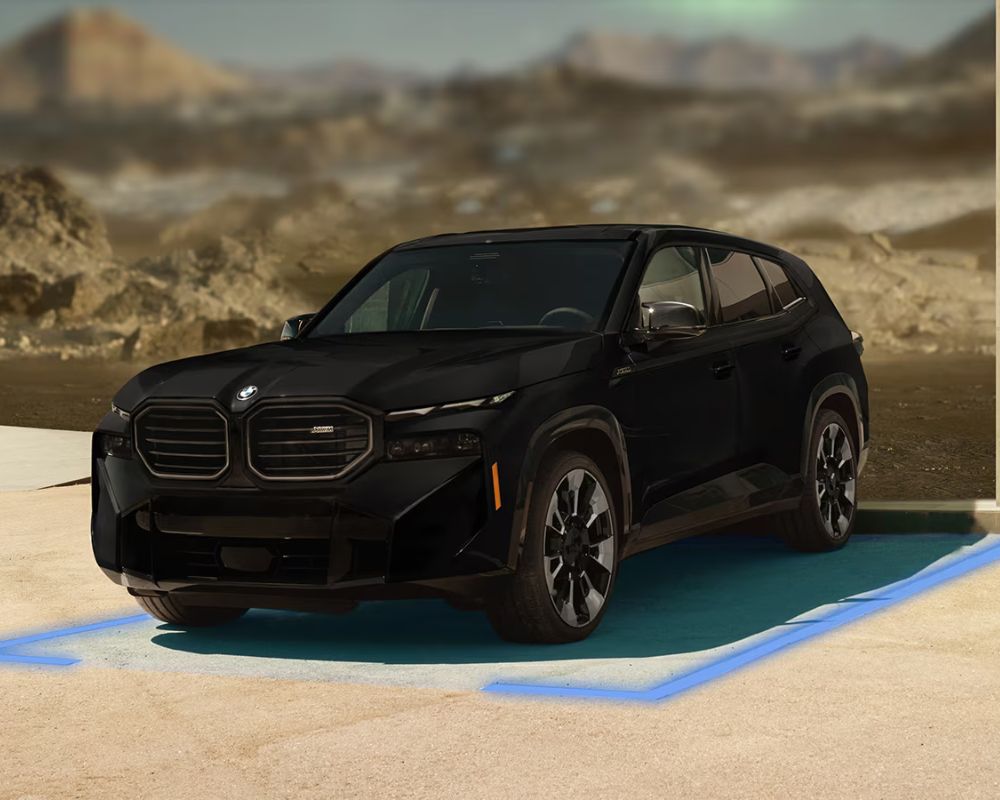 The 2024 BMW XM flaunts modern style and aerodynamic efficiency. Its front showcases oversized kidney grilles and sleek LED headlights. Sharp lines and a sculpted hood add to its dynamic vibe.