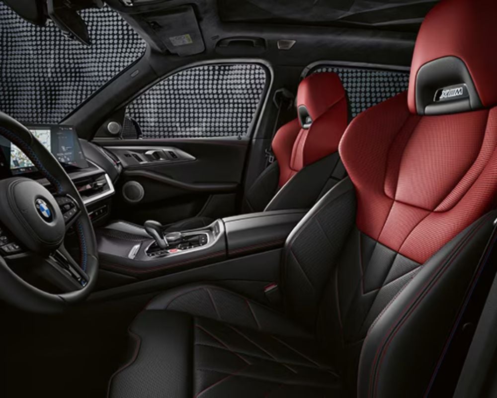 Inside the 2024 BMW XM, you have a blend of luxury and practicality. Premium materials like Merino leather and carbon fibre adorn the cabin. Front seats are heated, ventilated, and offer massages. Front seat dimensions are 1,027 mm headroom, 1,026 legroom, and 1,532 shoulder room.